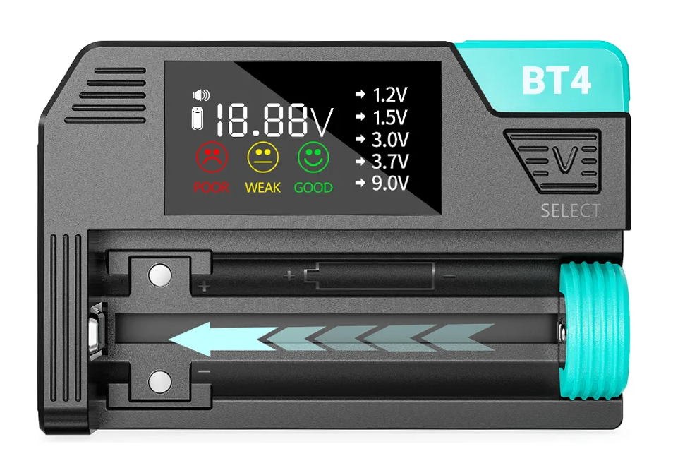 тестируемое напряжение: 1,2 В, 1,5 В, 3,0 В, 3,7 В, 9,0 В тестируемые размеры: AAA, AA, C, D, «Крона», пуговичные LR/AG