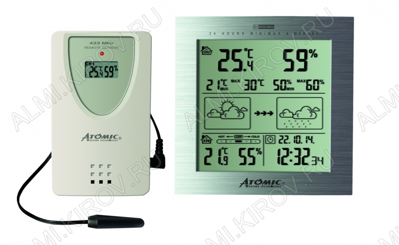 Измерение: наружной и внутр. температуры и влажности, календарь, часы, прогноз погоды на 24ч; питание 3хR6 радиодатчика 2хR3