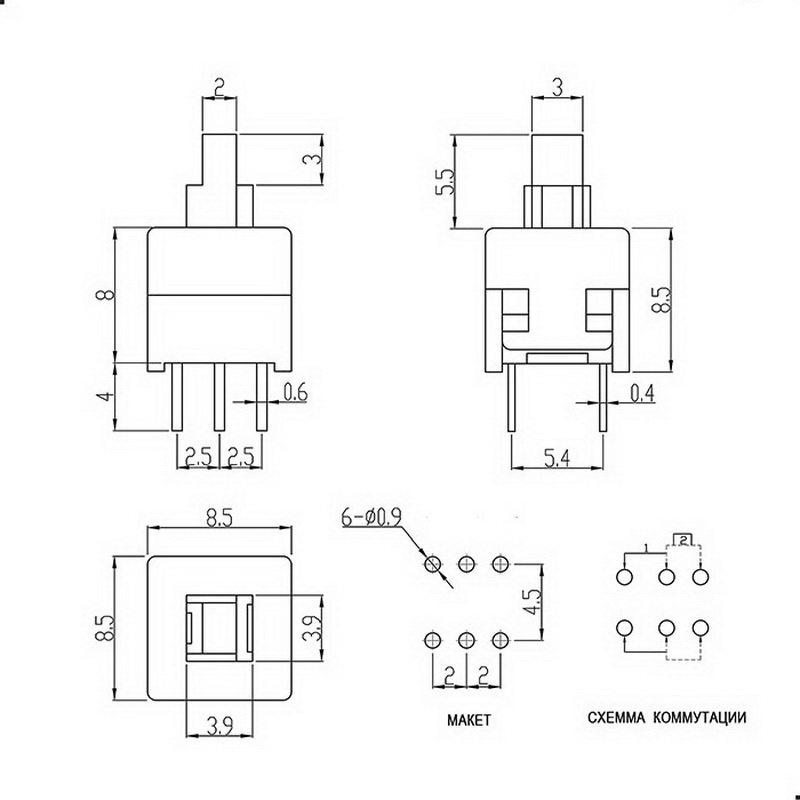 8.5x8.5x14mm; 0.1A/30VDC; 6pin