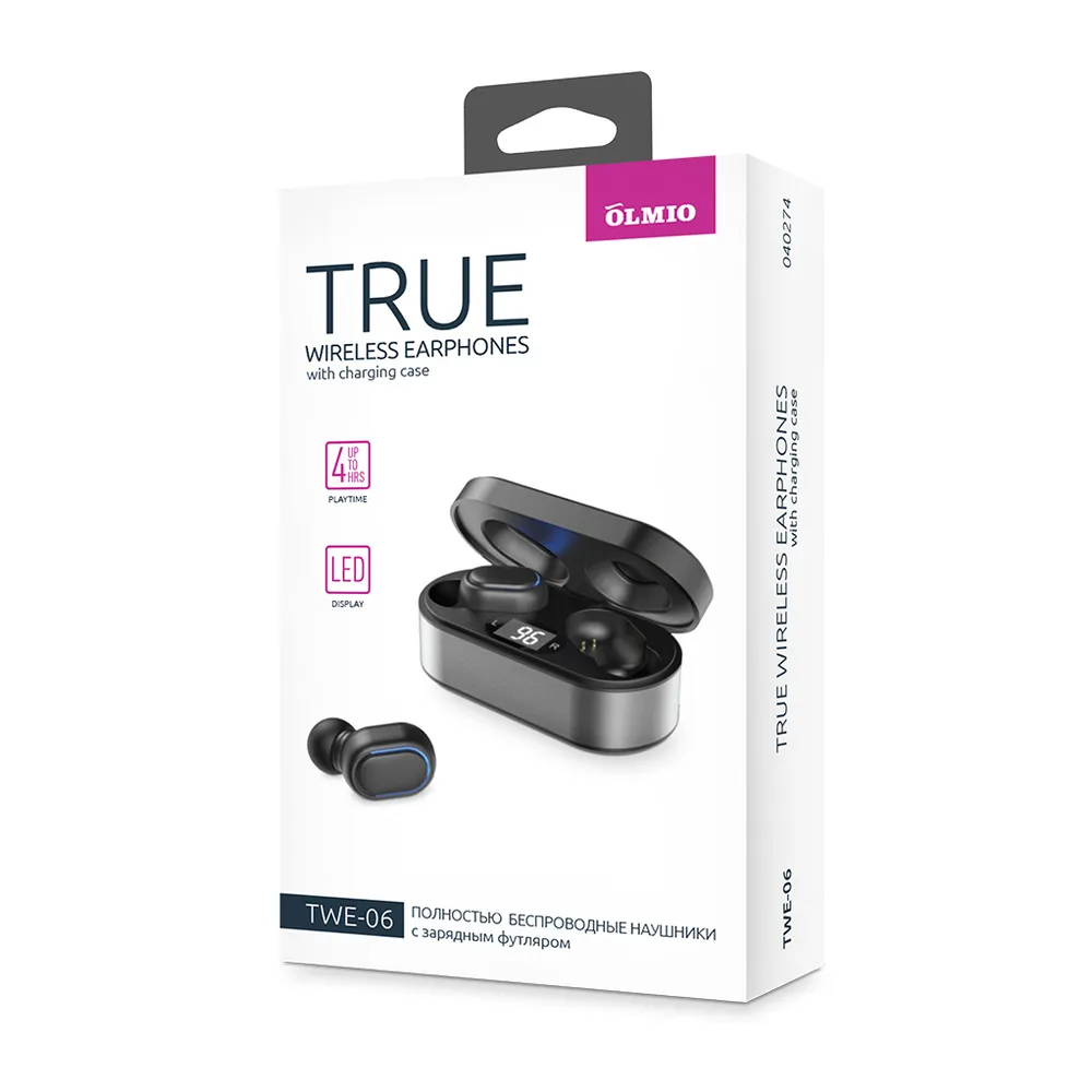 Наушники TWS OLMIO TWE-06 выполнены в компактном корпусе со встроенным LED-индикатором состояния и небольшим LCD-дисплеем, отличаются высокой эргономичностью за счет внутриканальной конструкции, а также качественным звучанием. Благодаря этим особенностям модель станет отличным выбором для любых условий и позволит не расставаться с любимой музыкой.