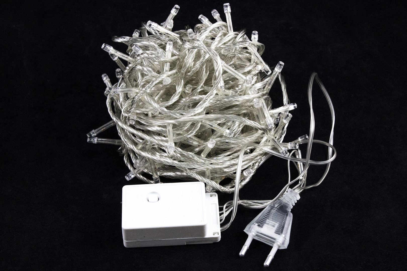 Длина гирлянды 13,5 метров, по все длине равномерно располагаются 200 LED лампочек. Провод прозрачный, силиконовый.