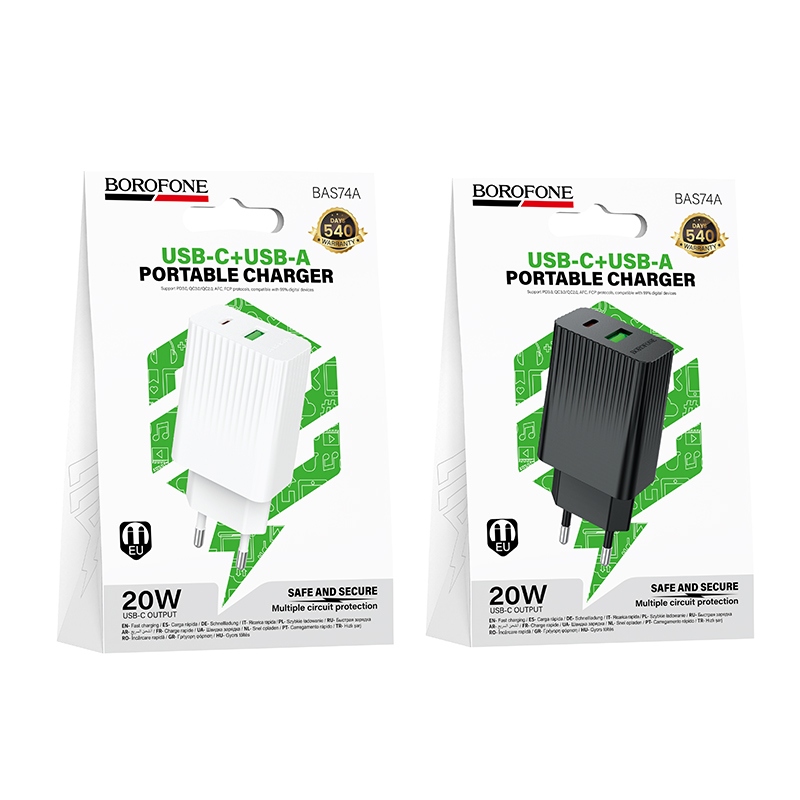 Сетевое зарядное устройство с выходами USB, Type-C, 3.0A, черный, BAS74A Source, PD20W+QC3.0;