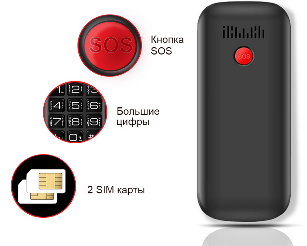 Телефон имеет самый необходимый функционал: поддерживает 2 активные SIM-карты, FM-радио, диктофон, аудио-плеер, оснащен аккумулятором 600 мАч, фонарик и, что очень важно, имеет кнопку экстренного вызова SOS, которая позволяет одним нажатием набирать ранее запрограммированные номера либо активировать рассылку СМС уведомлений.