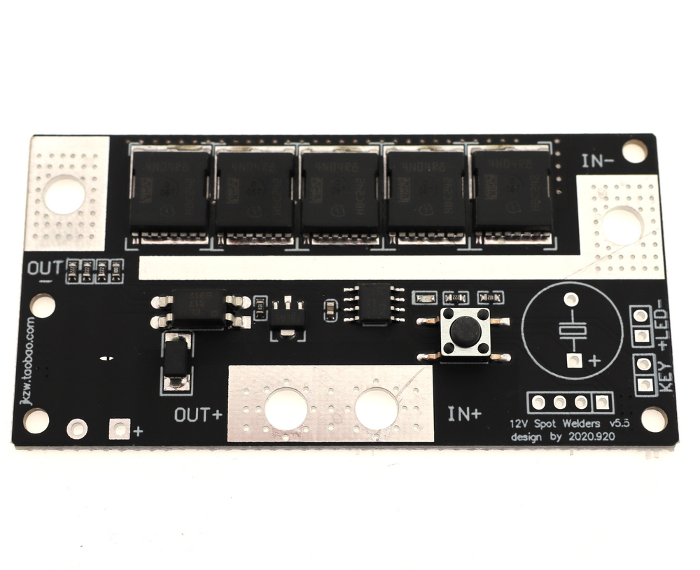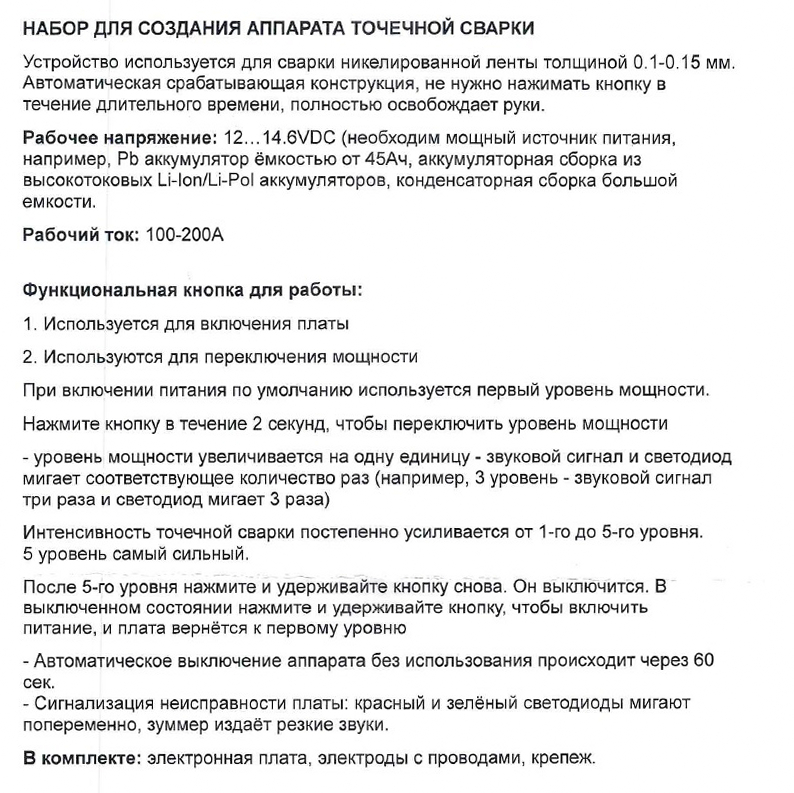 Питание: 12...14.6VDC; комплект из платы и электродов позволяет собрать аппарат точечной сварки; необходим источник питания высокотоковый Pb АКБ, Li-Pol АКБ, конденсаторная сборка