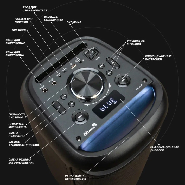 Bluetooth; 90W; USB, вход AUX, FM; встроенный аккумулятор 3,6Ач; 33х70х30 см